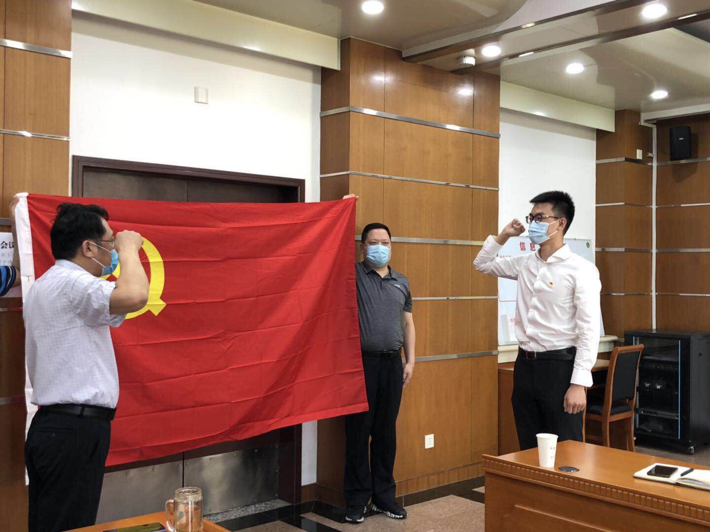 在主题党日活动现场举行了入党仪式,办公室新党员屈春晖同志,在鲜红的党旗前,庄严地举起右拳,向党宣誓,全体党员重温了入党誓词,进一步强化了为党的事业奉献终生的初心使命。