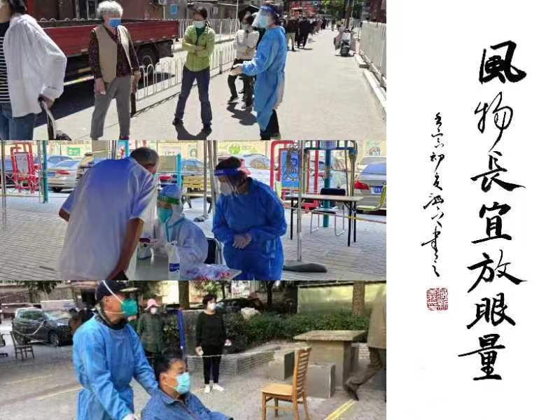党员就是旗帜,下沉社区就是最好的榜样。臧新义同志是一位书法家,在一天完成下沉任务后,他拖着疲惫的身体挥毫书写毛主席诗词名句:风物长宜放眼量,抒发了打赢疫情防控阻击战的信心和决心!他下沉的丰台区成寿寺街道文成建筑社区居民送来锦旗“齐心协力战疫情,我们与你们同在”。“一名党员就是一面旗帜,关键时刻就要向上冲,不能掉链子”,作为58岁的班子成员杨炳伟同志,一名30多年党龄的老党员,他是这么说,也是这么做的。他克服年龄大、高血压、高温等困难,主动报名参加下沉,每天早上不到5点就到社区开始工作,高温下一站就是几个小时,厚厚的防护服下全身湿透,双手被汗水泡的都是褶皱,但他一直坚守岗位,每天都圆满安全完成下沉任务。居住在朝阳区的吴薇、李睿、王蕊、张晶、杨丽、陈洋6名党员干部,严格按照要求,主动就地下沉社区,每天早出晚归担负核酸检测、健康宝筛查、维护秩序等任务,工作中任劳任怨,尽职尽责,成为最美的“大白和小蓝”。
