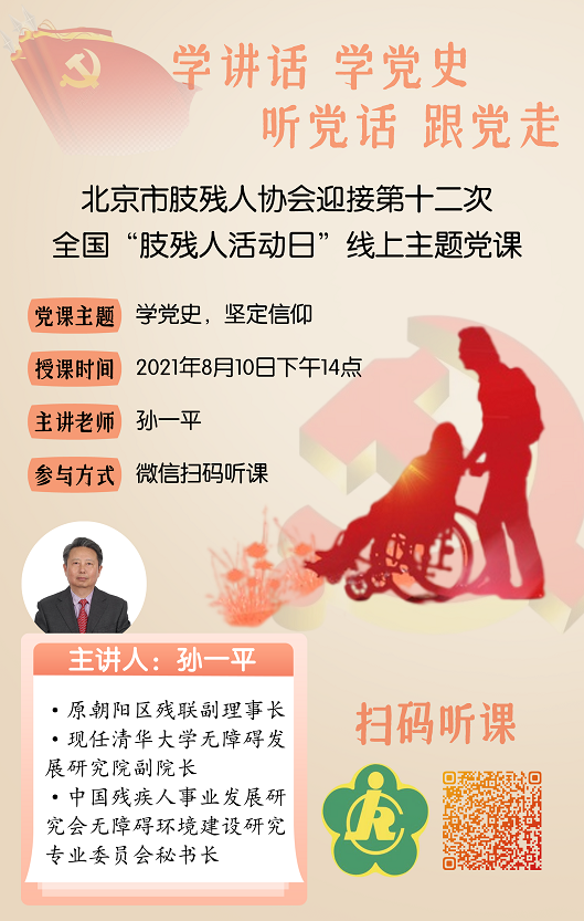 8月10日,协会特邀原朝阳区残联副理事长、现任清华大学无障碍发展研究院副院长、中国残疾人事业发展研究会无障碍环境研究专业委员会秘书长孙一平为大家带来“学党史 坚定信仰”的主题党课,2659人次在线收听收看。