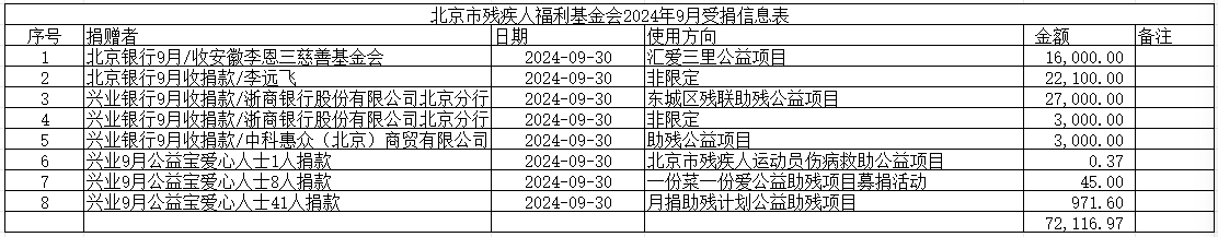 北京市残疾人福利基金会2024年9月受捐信息表