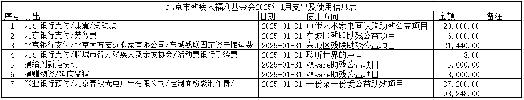 北京市残疾人福利基金会2025年1月支出及使用信息表