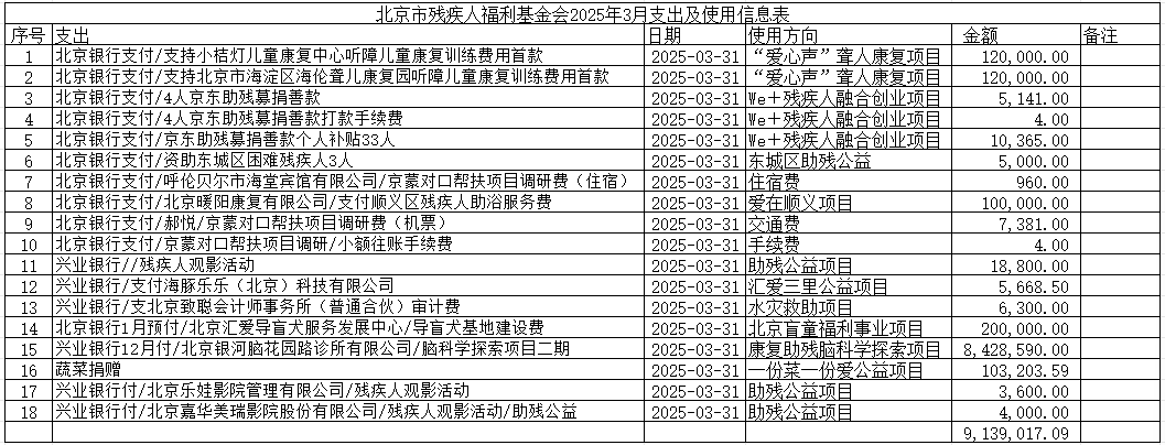 北京市残疾人福利基金会2025年3月支出及使用信息表