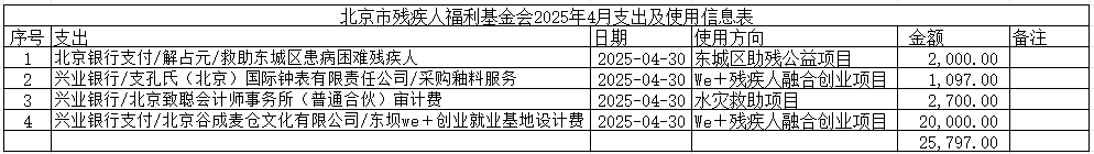 北京市残疾人福利基金会2025年4月支出及使用信息表